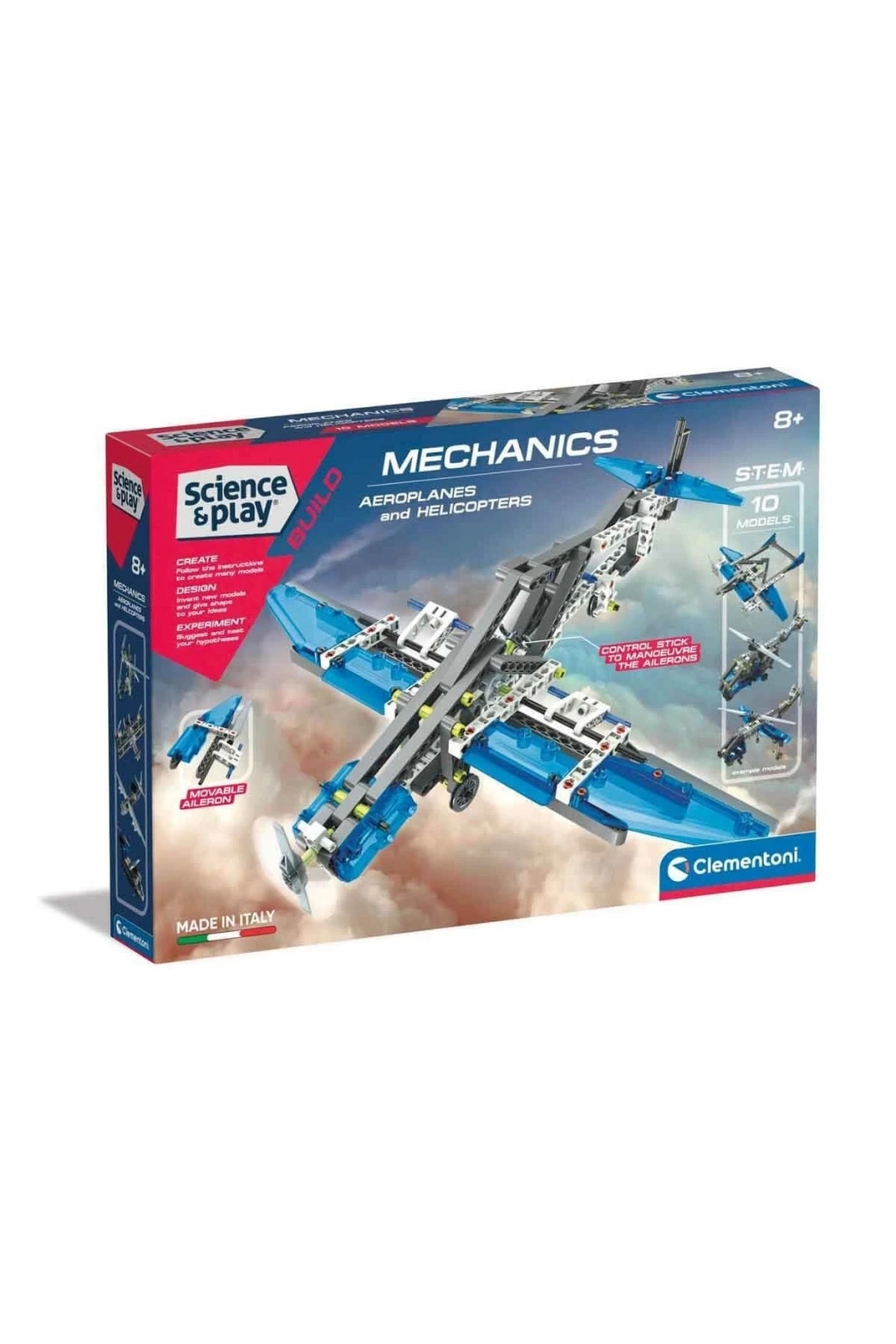 Aeroplanes and Helicopters ile eğlence gökyüzünü aşıyor! Bilim ve Oyun: Aeroplanes and Helicopters sadece bir inşaat oyuncağı sistemi değil, 7-8 yaş arası çocuk ve gençlerin mekaniğin ve fiziğin temel prensiplerini öğrenmelerine olanak sağlayan yaratıcı bir atölyedir.; Resimli kılavuzlar, her modelin montaj adımlarını açıklayarak, daha karmaşık makinelerin üretilmesini ve bireysel bileşenlerin gerçek hayattaki uygulamalarının anlaşılmasını mümkün kılar.; Kaldıraç nedir? Bu ne için? Bunları günlük yaşamda nerede buluruz? Teknolojik Bilim ve Oyun kitleriyle birlikte öğrenelim.; Clementoni'nin Techno-Logic Laboratuvarları serisi, çocukların Bilim, Teknoloji, Mühendislik ve Matematiğin incelenmesi ve pratik uygulaması yoluyla eleştirel düşünmeyi ve problem çözmeyi geliştirmelerine yardımcı olan bir öğretim metodolojisi olan STEM'den ilham almıştır.; Bu kit, diferansiyel, kremayerli direksiyon ve kardan mafsalı dahil olmak üzere montajı yapılacak 200'den fazla bileşen içerir.; 10 muhteşem ve dinamik modeli keşfedebilir ve inşa edebilirsiniz! Bilim ve Oyun Serisi, olası çözümler ve oyun senaryoları oluşturup icat ederken çocukların eğlenmesi için harika bir oyun deneyimi sunar.; Farklı bileşenlerin bir araya getirilmesiyle çocuklar, kendi kurgularından hangi senaryoların hayata geçebileceğini somut olarak doğrular ve fikirleri kendi elleriyle şekillendirir.; Kutu ölçüsü: 40 x 6,5 x 28 cm