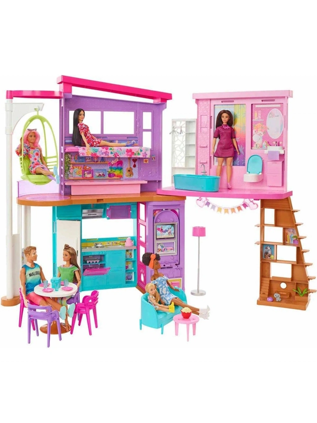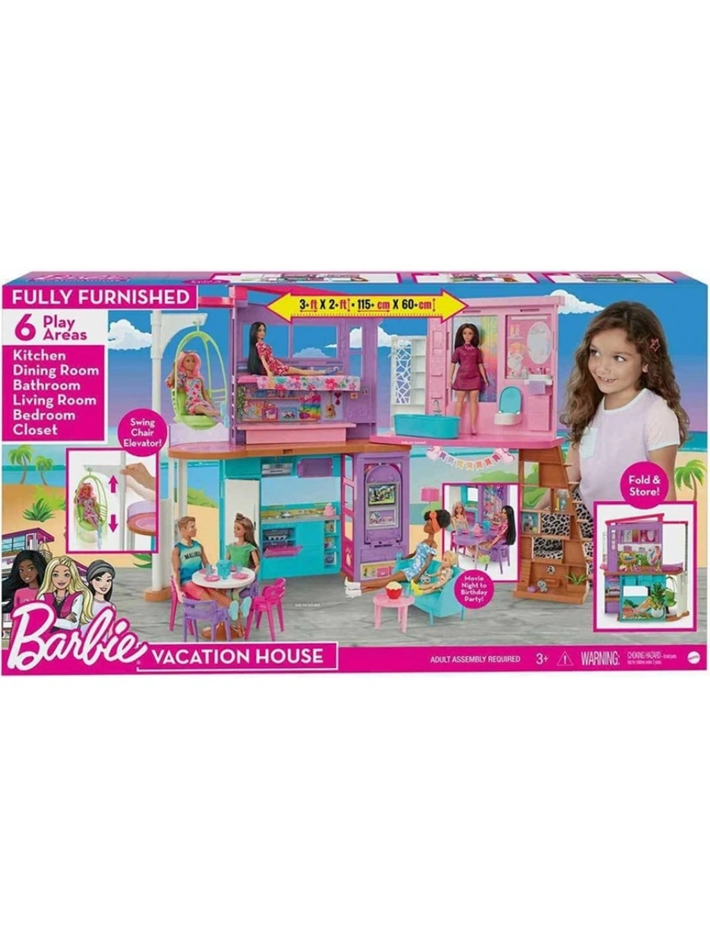 Çocuklar, bu 2 katlı Barbie evinin kapılarını açtığında yatak odası, banyo, mutfak, yemek odası, oturma odası ve gardırop gibi altı oyun alanı ile sınırsız oyun imkanını keşfedebilir. Asansör olarak da kullanılabilen sallanan sandalyesi ve hem film geceleri hem de doğum günü partilerine yer sağlamak için yukarı ve aşağı doğru hareket eden duvarıyla modern ve şık tasarımlı bu Barbie evi, eğlenceli hikayelere ilham verir.