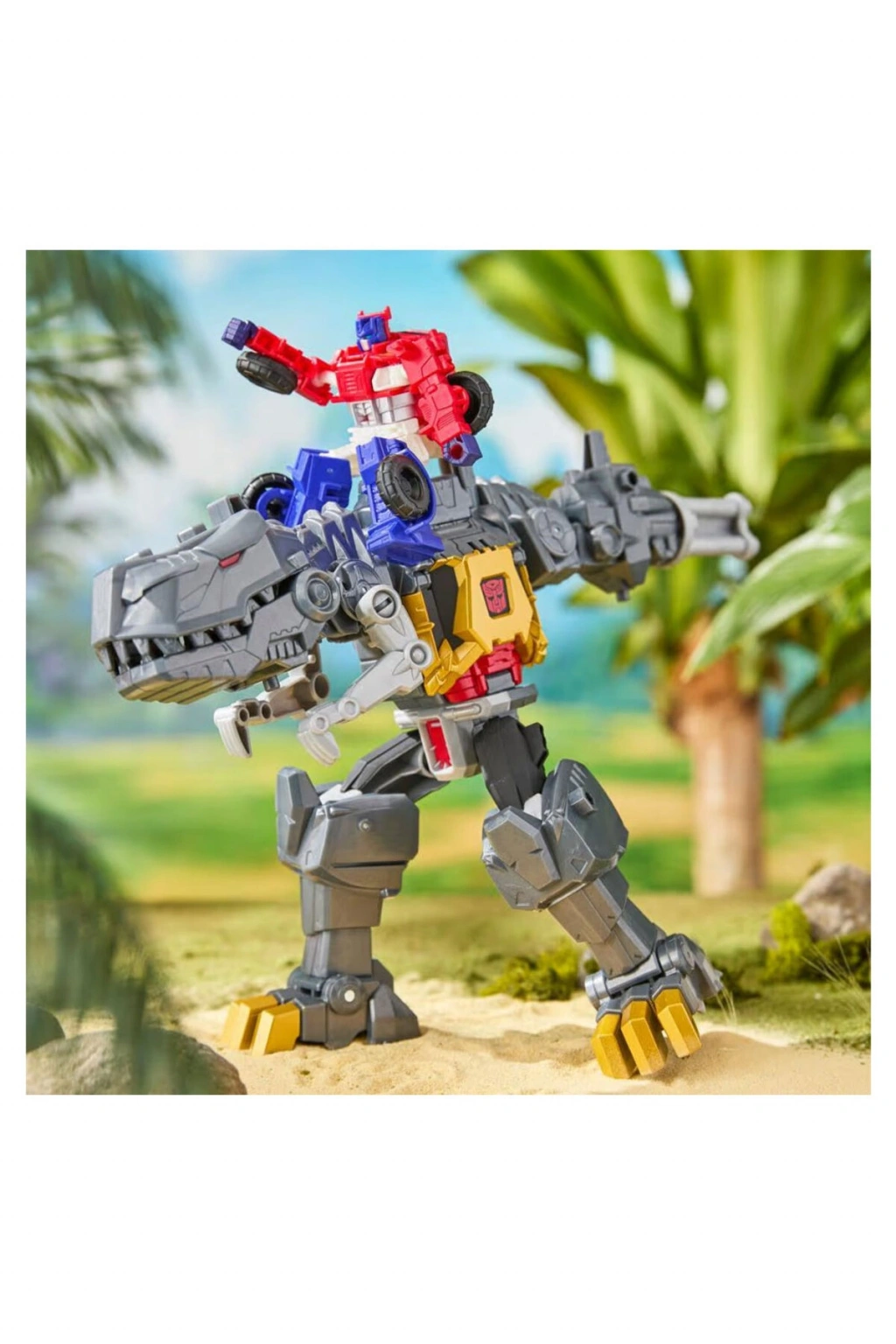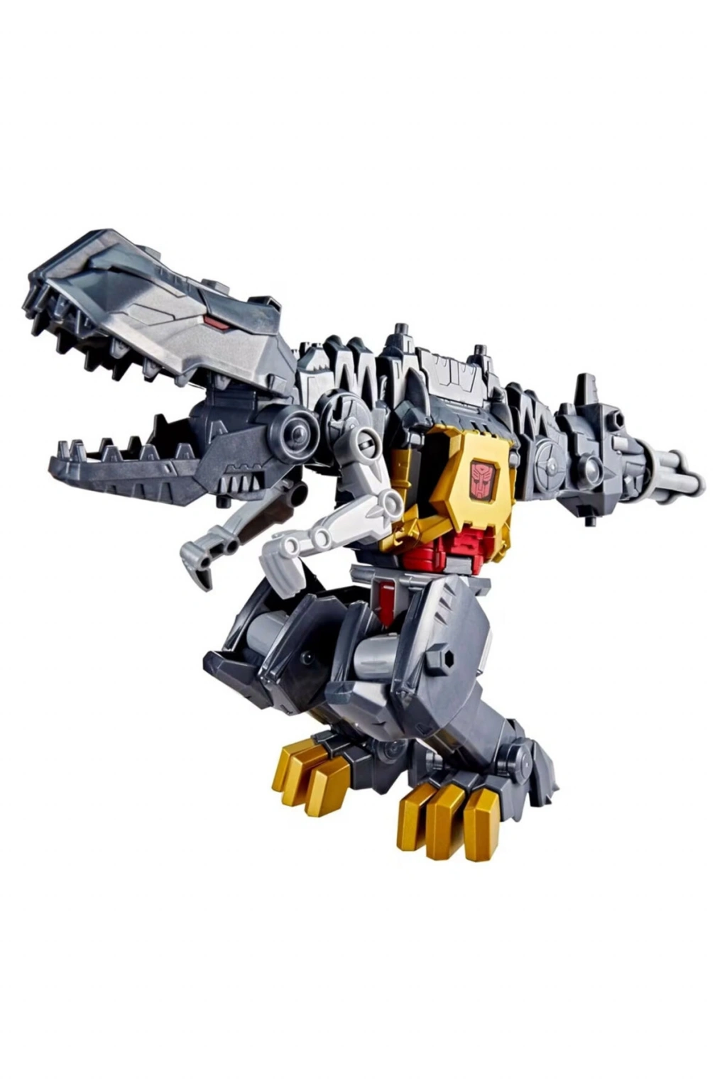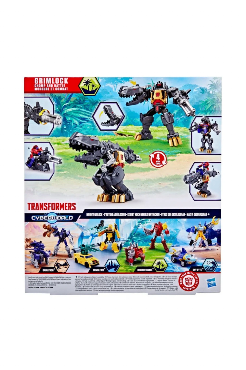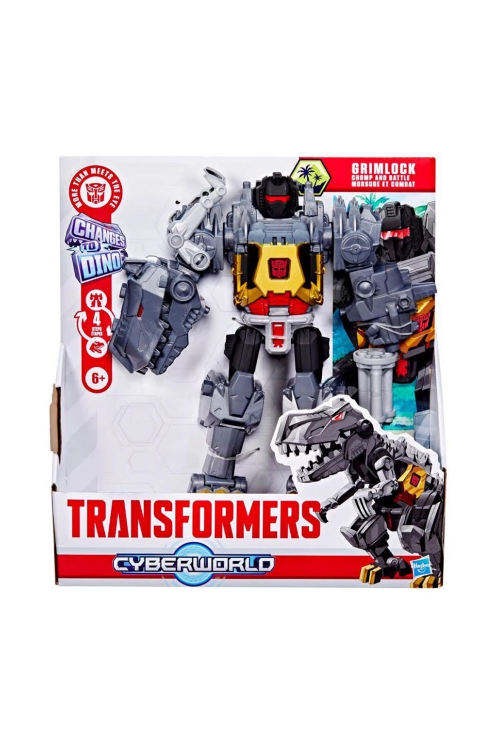 Transformers Cyberworld'de çocuklar olayı belirler ve bu Grimlock Chomp & Battle figürü gibi harika oyuncaklarla başlar.; Bu 22,5 cm büyüklüğündeki Grimlock oyuncak, 6 yaşından büyük çocuklar için yeterince kolay olan sadece 4 adımda robottan dinozor moduna dönüştürülebilir.; Robot modunda bu oyuncak bir döner silah kolu, geçmeli bir dino kolu ve Cyber Changers figürleri için mekanik zırhı açabilen bir göğüs plakasına sahiptir (her biri stok durumuna göre ayrı satılır).; Dino modunda oyuncağın bir dinozor kafası ve dönen bir blaster kuyruğu vardır.; Cyber Changers figürleri sırtına binebilir.; Ek Cyberworld oyuncakları ile (stok durumuna göre ayrı satılır) çocukların anlatım gücü desteklenir ve benzersiz karakterler, ikinci modlar, ortamlar ve daha fazlasını keşfedebilirsiniz.