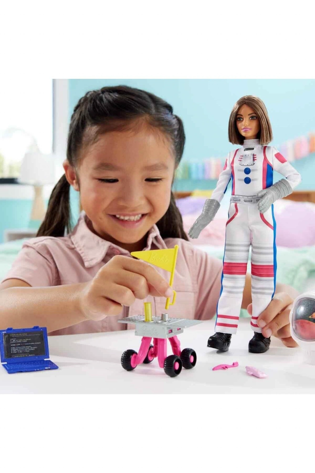 Barbie buradaydı! Barbie'nin 65. yıl dönümünü, bu astronot seti gibi hayranların en sevdiği mesleklerin öne çıktığı bebek koleksiyonuyla kutlayın.; Barbie, ikonik pembe detaylara sahip bir uzay kıyafeti giyer ve astronot kaskı ile tekerlekli uzay keşif aracı dahil 10 adet temalı aksesuara sahiptir.; Çocuklar taklit oyunlarıyla hayal güçlerini geliştirebilir.; Hayranların en sevdiği rollerinin bulunduğu Barbie 65. Yıl Dönümü Kariyer Bebekleri ve aksesuar setleriyle çocuklar, çalışma dünyasını keşfedebilir.; Astronot seti gibi diğer oyun setlerinde de bir adet bebek ve bebeğin mesleğiyle ilgili 10 adet aksesuar bulunur.; Bazı aksesuarlarda etkileşimli özellikler vardır.; Çocuklar, hayal güçlerini harekete geçirerek uzaya çıkabilir, araştırmalar yapabilir veya kasklarını çevirerek yıldızları izleyebilir! Dizüstü bilgisayar, atıştırmalık ve bayrak gibi parçalar içeren ek aksesuarlar taklit oyunlarının eğlencesini artırır.; Havalı detaylara sahip, çıkarılabilir uzay kıyafeti, uzay eldivenleri ve büyük uzay botlarıyla esmer astronot bebeği uzayda yürüyormuş gibi hareket ettirebilirsiniz.; Çocuklar, Barbie ve 65. Yıl Dönümü Kariyer Koleksiyonu ile büyük hayaller kurmaya devam edebilir.; Barbie, oyun saatine renk katar, çocukları çeşitli hikayeleri hayal etmeleri için teşvik ederken onların yaratıcılıklarının ve oyun kurma becerilerinin gelişmesine de katkı sağlar.; Çocuklar Barbie ile oynarken sınırsız hayal kurar.; Çocukların arkadaşları ile oynayacakları oyunlar sosyalleşmelerine katkı sağlar.; Kutu içerisinde; Barbie bebek, oynar siperlikli kask, eldiven, keşif aracı, dizüstü bilgisayar, kulaklık, bayrak, deney tüpü, diş fırçası, diş macunu ve atıştırmalık bulunmaktadır.; Kutu ölçüsü: 19 x 6 x 32,5 cm Ağırlık: 0,219 kg
