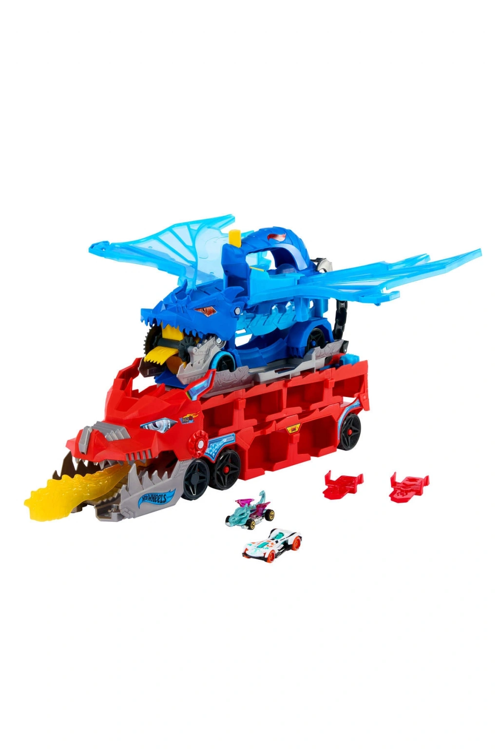 Ekstra çıkarılabilir ejderhası oyuncak arabaları yiyen büyük ölçekli ejderha taşıyıcıyla mücadeleye atılın. Ateş püskürten ejderhayla arabaları devirdikten sonra küçük ejderhanın kilidini açın ve piste dönüştürün. Düğmeye basarak ejderhanın kanatlarını gerçek bir ejderha gibi çırpmasını izleyin. Ardından süzülüp arabaları mideye indirin. Büyük ejderhaya geri dönün ve araçları fırlatıcılara göndererek iki şeritli pistte yarıştırın. Taşıyıcı tıra iki adet 1:64 ölçekli araba dahildir ancak çocuklar, ejderhaların içinde ve üzerinde 20'den fazla araç taşıyabilir. (Diğer arabalar ayrı olarak satılır.) Arabaları fırlatabilir veya ön kısma Hot Wheels pisti bağlayarak pistte yarıştırabilirsiniz. Renkler ve süslemeler çeşitlilik gösterebilir.