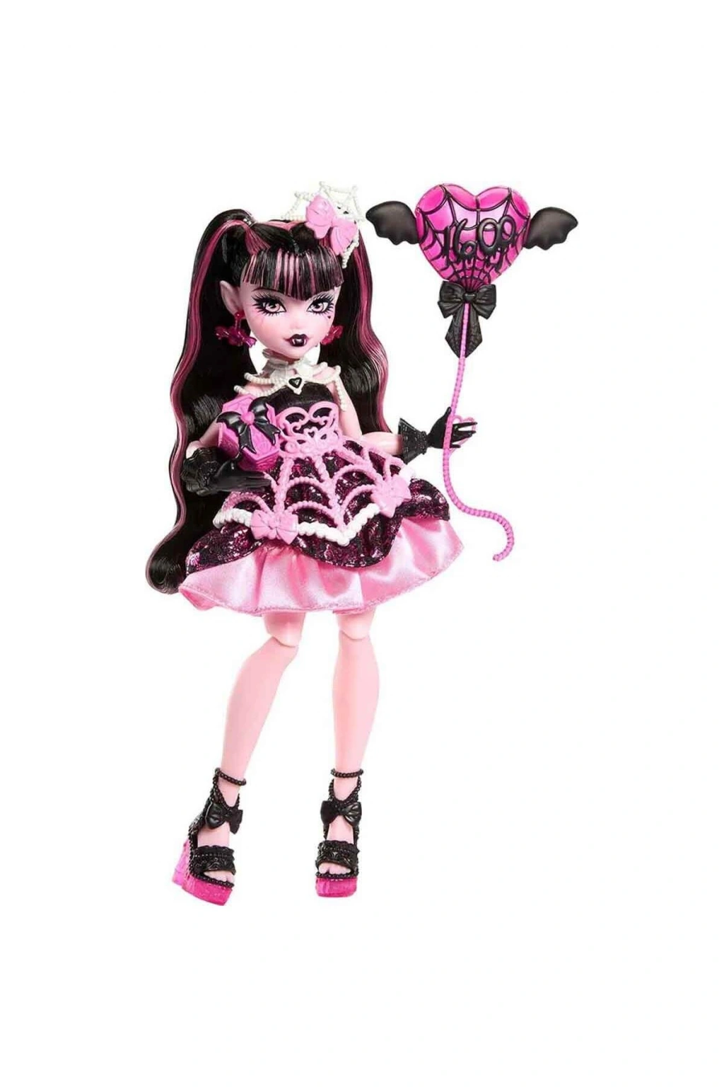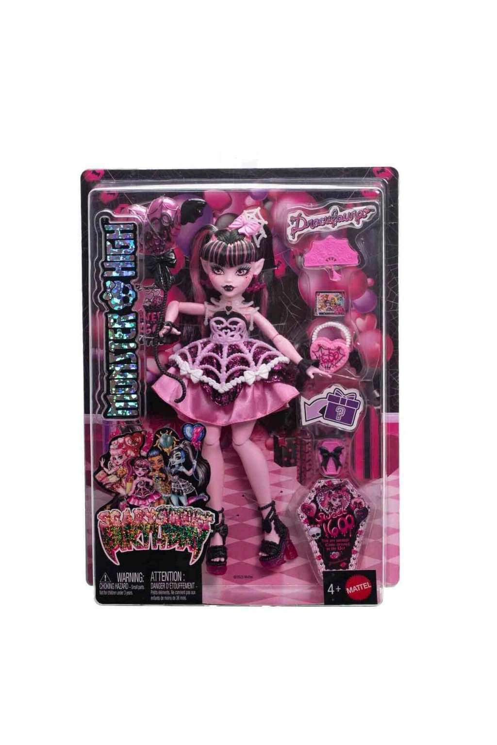 Monster High bebekleri, yüzyılın en ürpertastik kutlamasına davetli! Draculaura, havalı bir Doğum Günü partisi düzenliyor.; Bebeğin 1600. yaş gününü, bu özel güne yakışır muhteşem bir partiyle kutlamalarına yardım et! Doğum günü bebeklerinin her biri muhteşem görünür, balon, davetiye, doğum günü kartı ve hediye gibi temaya uygun parçalar ile birlikte gelir.; Çeşitli havalı aksesuarlar sayesinde bu partide eğlencenin sınırı yok! Draculaura 1600. yaşına basıyor.; Monster High öğrencileri de sıkı dostlarının bu özel gününü kutluyor.; Bebekler, muhteşem kıyafetleri ve aksesuarları ile dans pistinde göz kamaştırmaya hazır.; İçinde sürpriz hediyeler olan Draculaura'nın hediye paketleri gibi parti temalı aksesuarlar, Doğum Günü için muhteşem hikayelere ilham veriyor.; Çocuklar ve koleksiyoncular, makyaj malzemesi ve çanta gibi aksesuarlar ile bebeklerin doğum günü partisine hazırlanmasına yardımcı olurken çok eğlenecekler! Parti ne kadar kalabalık olursa o kadar güzel geçer.; Tüm sıkı dostlar ekibiyle ürpertastik bir kutlama gerçekleştirmek için Doğum Günü koleksiyonunun tamamına göz atabilirsiniz! Çocukların yeni hikayeler oluşturarak hayal güçlerinin ve yaratıcılıklarının gelişmesini desteklerken onların oyun kurma ve taklit becerilerine katkı sağlar.; Arkadaşlarıyla oynayacakları oyunlar sosyalleşmelerine yardımcı olur.; Koleksiyon merakını destekler.; Ürünün; Frankie Stein, Draculaura, Cupid Asteria ve Cleo Denile olmak üzere 4 farklı modeli bulunmaktadır.; Paket içerisinde; bebek, balon, çanta, davetiye ve çeşitli aksesuarlar bulunmaktadır.; Paket ölçüsü: 24 x 6,5 x 32,5 cm