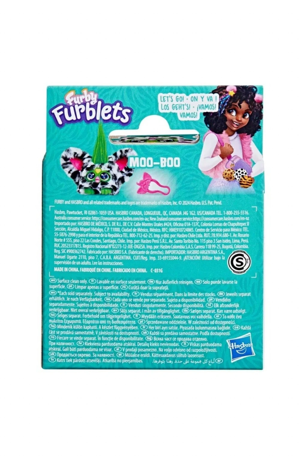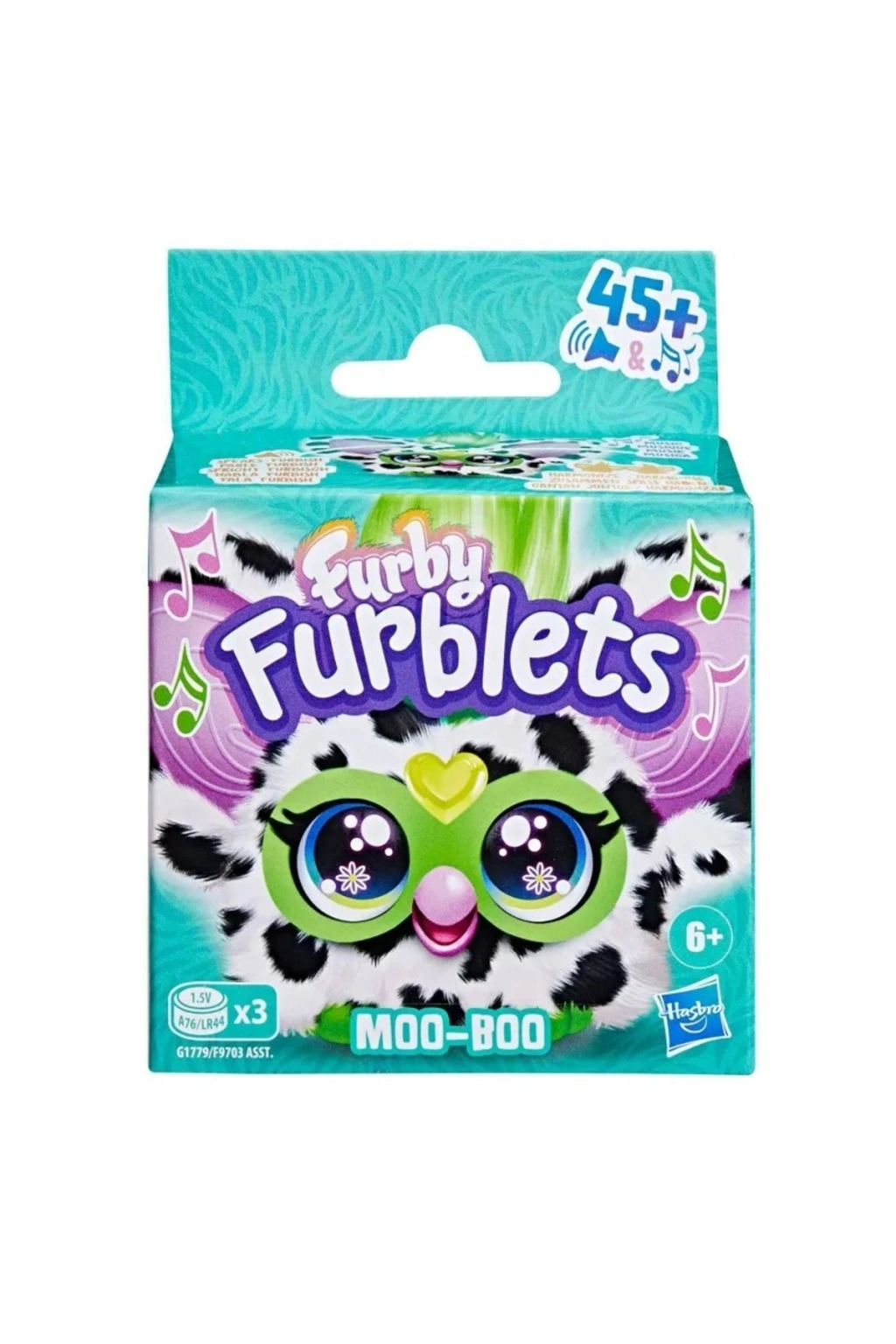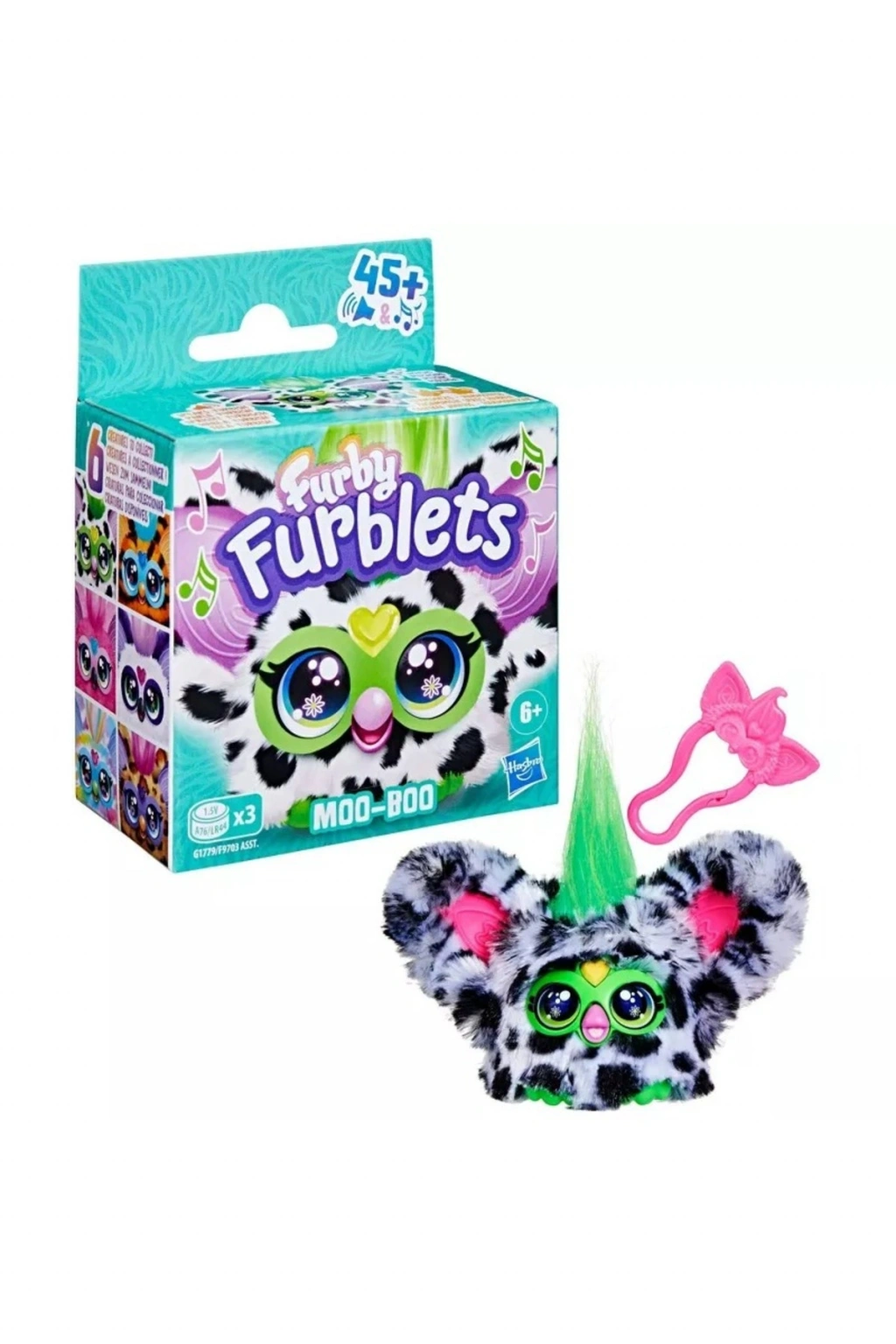 Furby Furblets MOO-BOO, siyah-beyaz desenli tasarımı ve canlı renkleriyle öne çıkar. 45’ten fazla ses ve müzik özelliği ile çocukların hayal gücünü destekler ve eğlenceli oyunlar sunar.