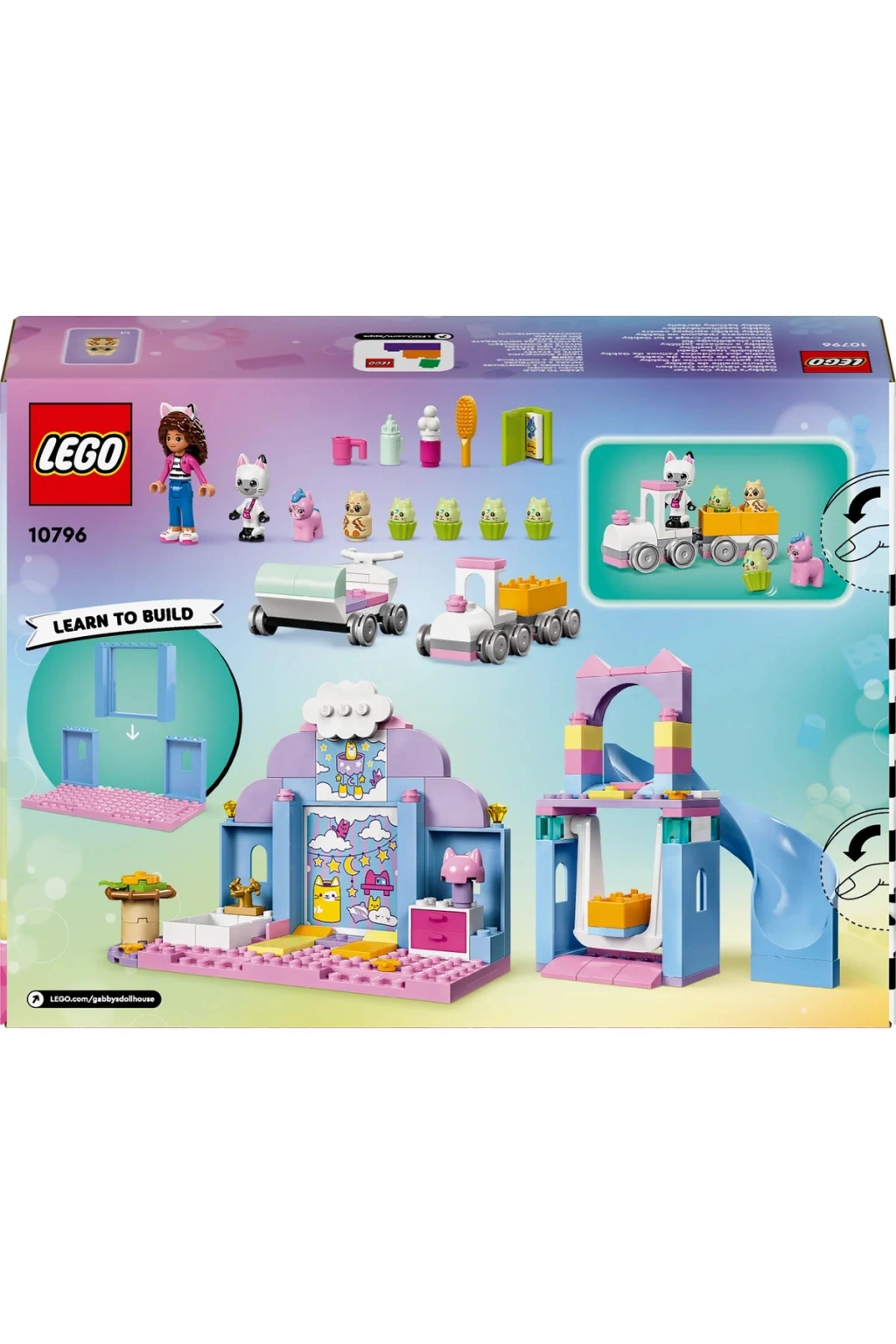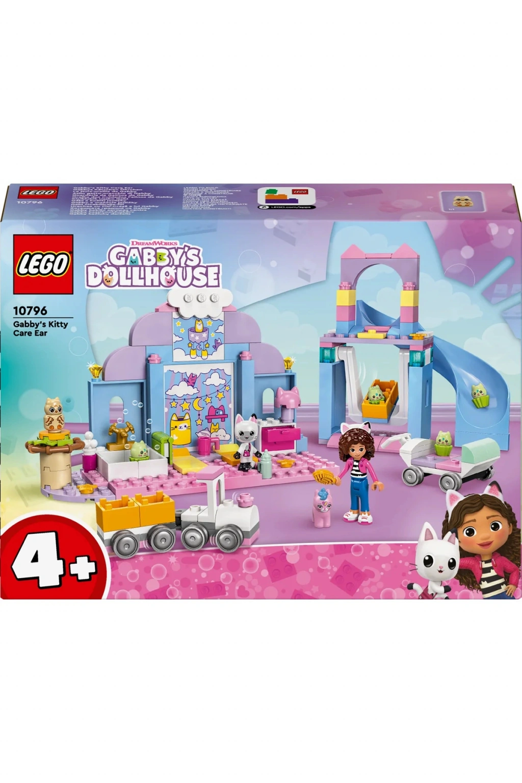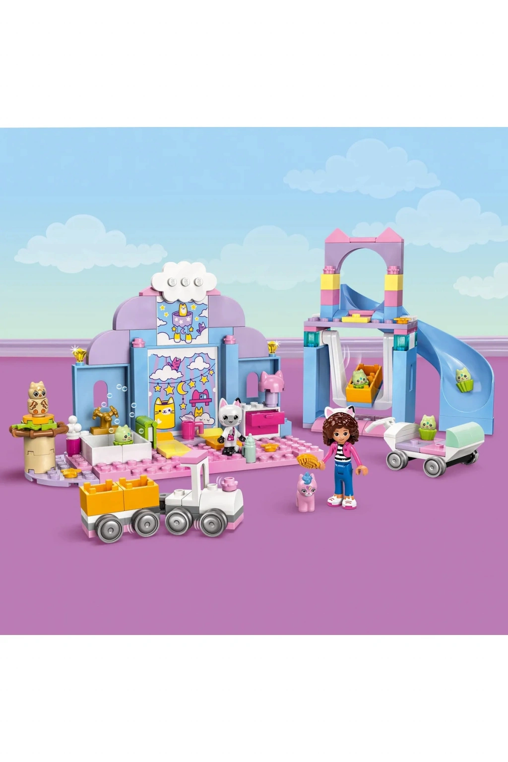 Gabby ve Pandi Pati, Kedicik Bakım kaydırağının altında Yavru Kediboynuz, Yavru Kedi-Kuş ve 4 Yavru Kapkek’i karşılar. 4 Yavru Kapkek, Gabby’ye katılarak kapkek kutusu arabasında dolaşırken, Yavru Kedi-Kuş ve Yavru Kediboynuz da Pandi’nin trenine biner. Banyo yapıp temizlendikten sonra biberonla beslenir ve tüylerini taratırlar. Sakinleştirici bir hikayeden sonra, sallanan beşiklerinde öğle uykusu zamanı.