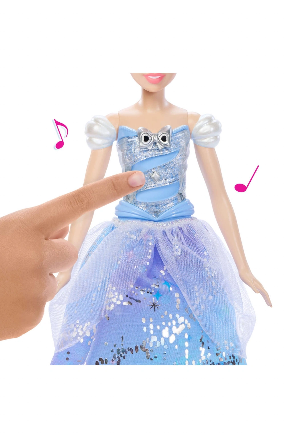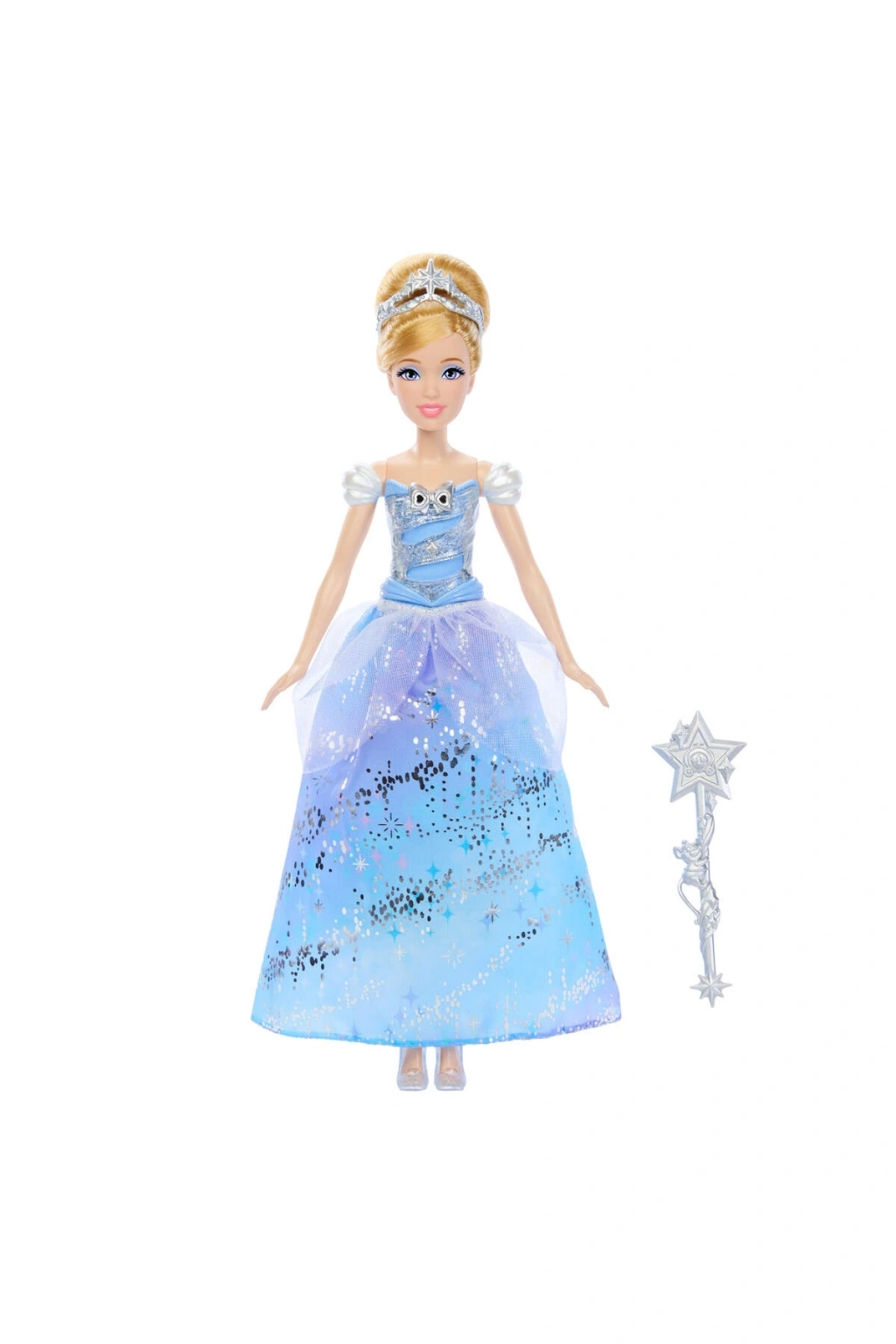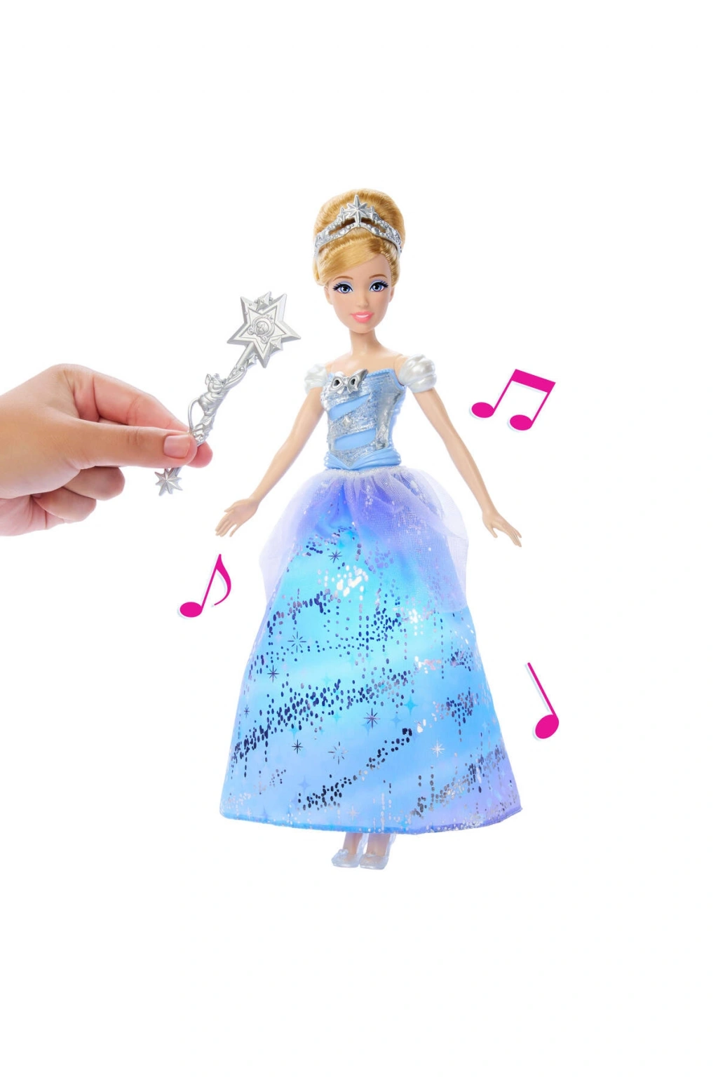 Sihirli Balo Elbiseli Disney Cinderella bebek, Disney filmindeki unutulmaz sahneye hayat verir: Sihirli değnek sallandığında Cinderella'nın elbisesi ışıldayarak bambaşka bir tarza dönüşür. Çocuklar sete dahil değneği (veya ellerini) Cinderella'ya doğru sallayarak heyecan verici anı evde yeniden canlandırabilir. Rengarenk ışık gösterisine büyüleyici ses efektleri eşlik eder. Sihirli sözler söylemenize gerek yok! Bebek tek başına ayakta duramaz. Renkler ve süslemeler çeşitlilik gösterebilir.