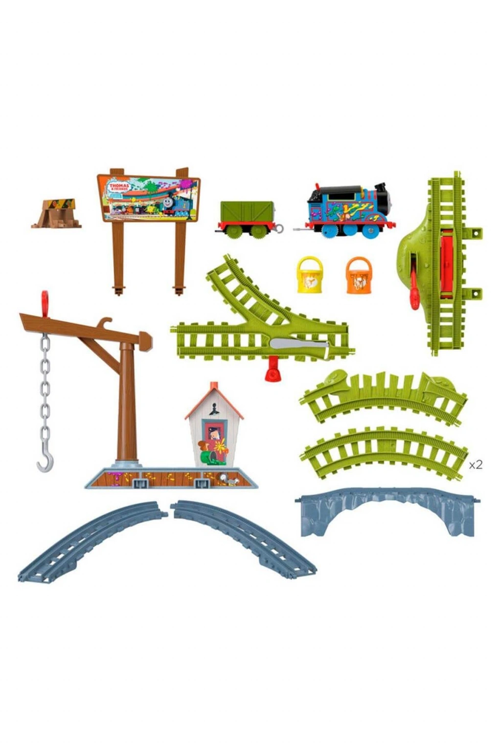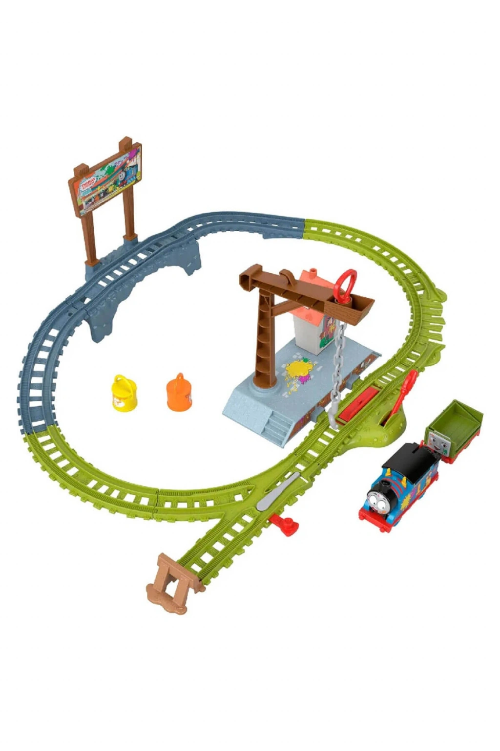 Thomas ve Arkadaşları: All Engines Go'dan ilham alan bu motorlu tren ve ray setinde çocuklar, Thomas ve Troublesome Truck ile birlikte boya teslimatı yaparken eğlenceli maceralara atılabilir.; Her yere sıçradı! Tren köprünün üzerinden geçerken 2 boya kutusu Troublesome Truck'tan dökülür.; Thomas'ı ilerletmek için motorun üzerindeki düğmeyi çevirin, boya kutusunu yüklemek ve boşaltmak için vinç kancasını kullanın.; Yükleme işlemi için vinç 360 derece döner.; Kutu içerisinde; tren, Troublesome Truck, 2 adet kargo, 8 adet pist parçası ve 3 adet pist aksesuarı bulunmaktadır.; Ürün; 2 x 1,5V AAA pil ile çalışmaktadır.; Piller kutuya dahil değildir.